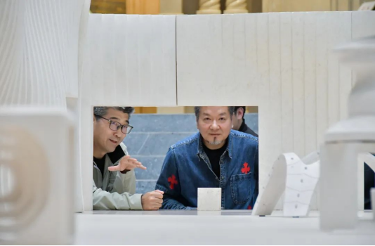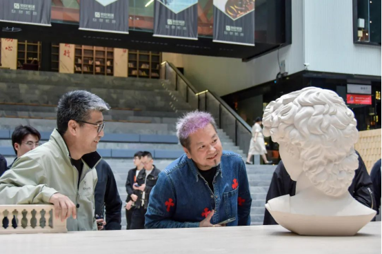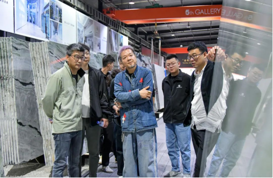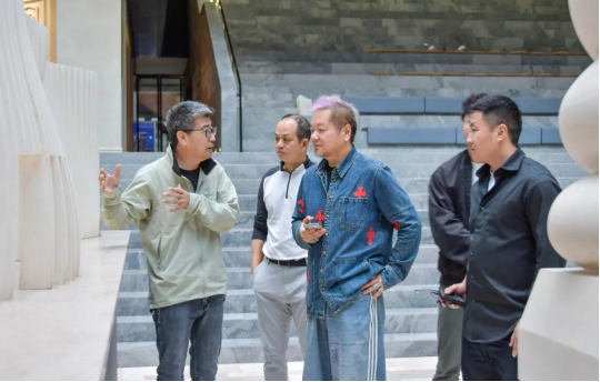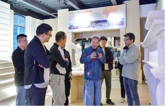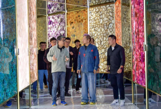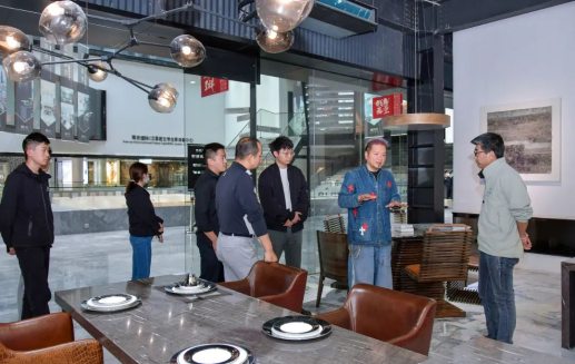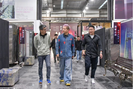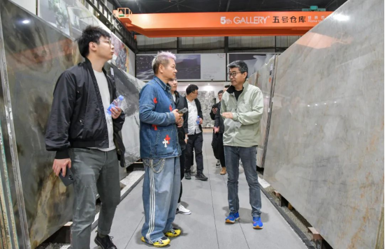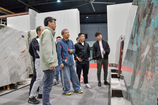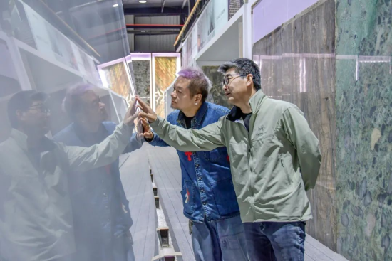 参观中,戴昆老师对五号仓库展厅4.0的升级改造提出了很多宝贵的建议,并与刘良董事长就石材的工艺、石材的可塑性与创造性、天然石材的空间应用、对石材色彩的设计把控等方面进行了深入的交流与探讨。